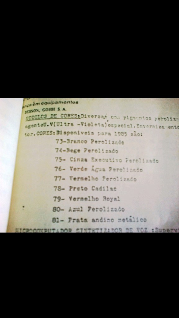 - 88/89: vermelho transparente, vermelho magenta, vermelho perolizado 89, vermelho, vinho, dourado, preto, preto cadilac, preto granito, amarelo, amarelo perolizado, branco polar, branco perolizado, azul metálico, azul itapema e prata andino.